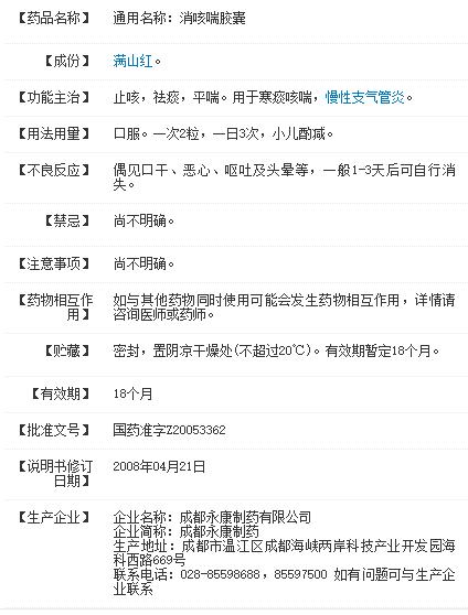 商品名称: 消咳喘胶囊 批准文号: 国药准字Z20053362