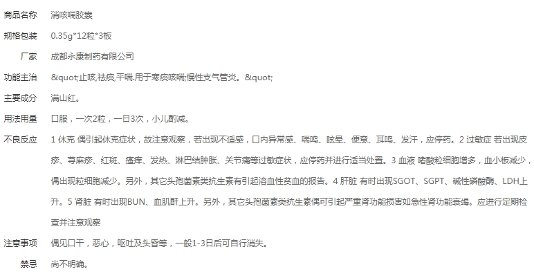生产厂商: 成都永康制药有限公司 包装规格: 0.35g*36粒
