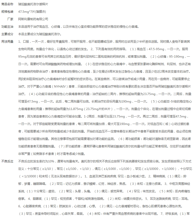 商品名称:琥珀酸美托洛尔缓释片(倍他乐克)